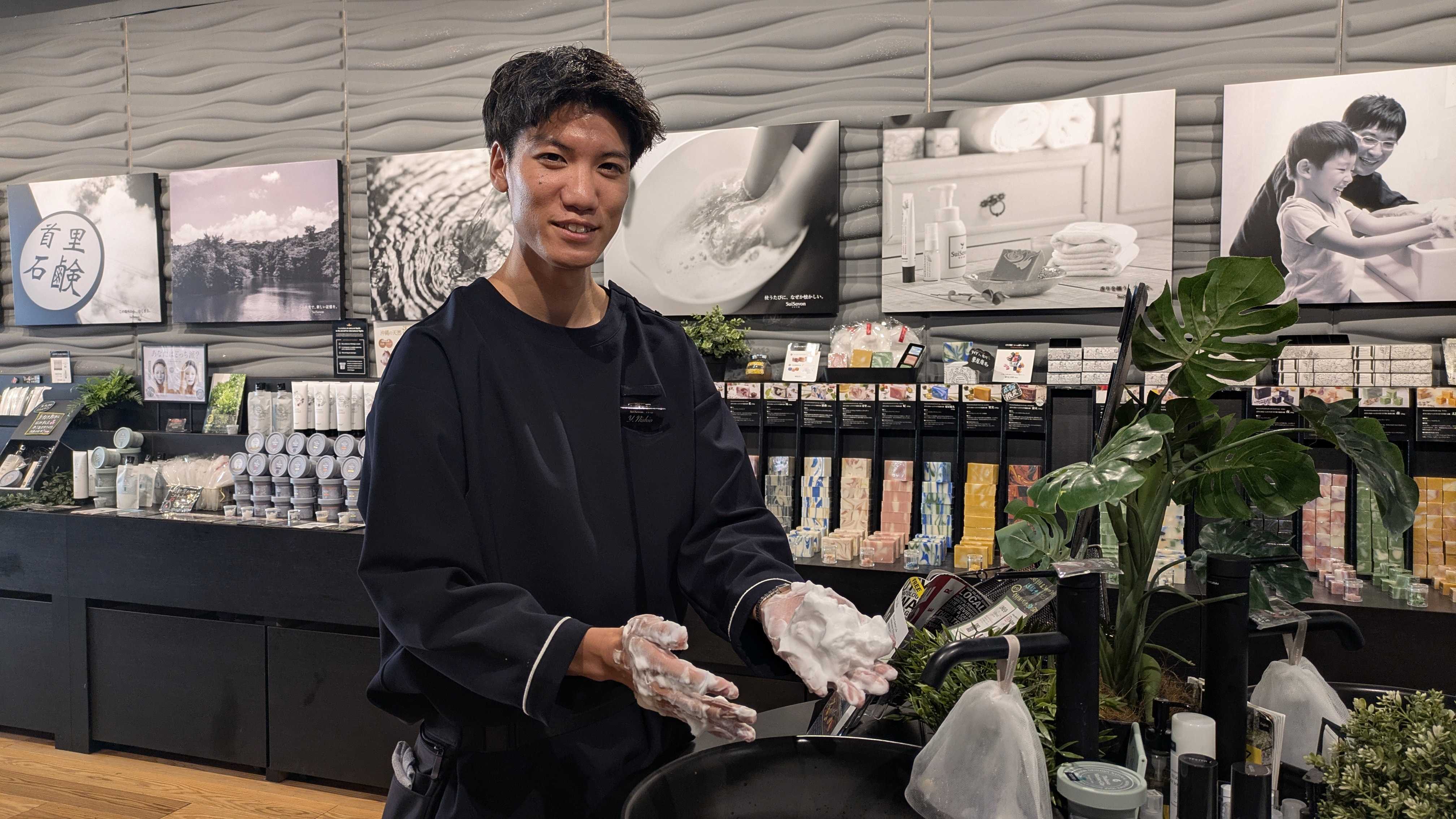 首里石鹸では、水場体験など実際に商品に触れていただく機会が多く、お客様と一緒に「体験」を楽しめるところが魅力です。特にハンドクリームのタッチアップをした際に、「すごい!」と驚いた表情を見せていただけた瞬間は、とても嬉しいです。