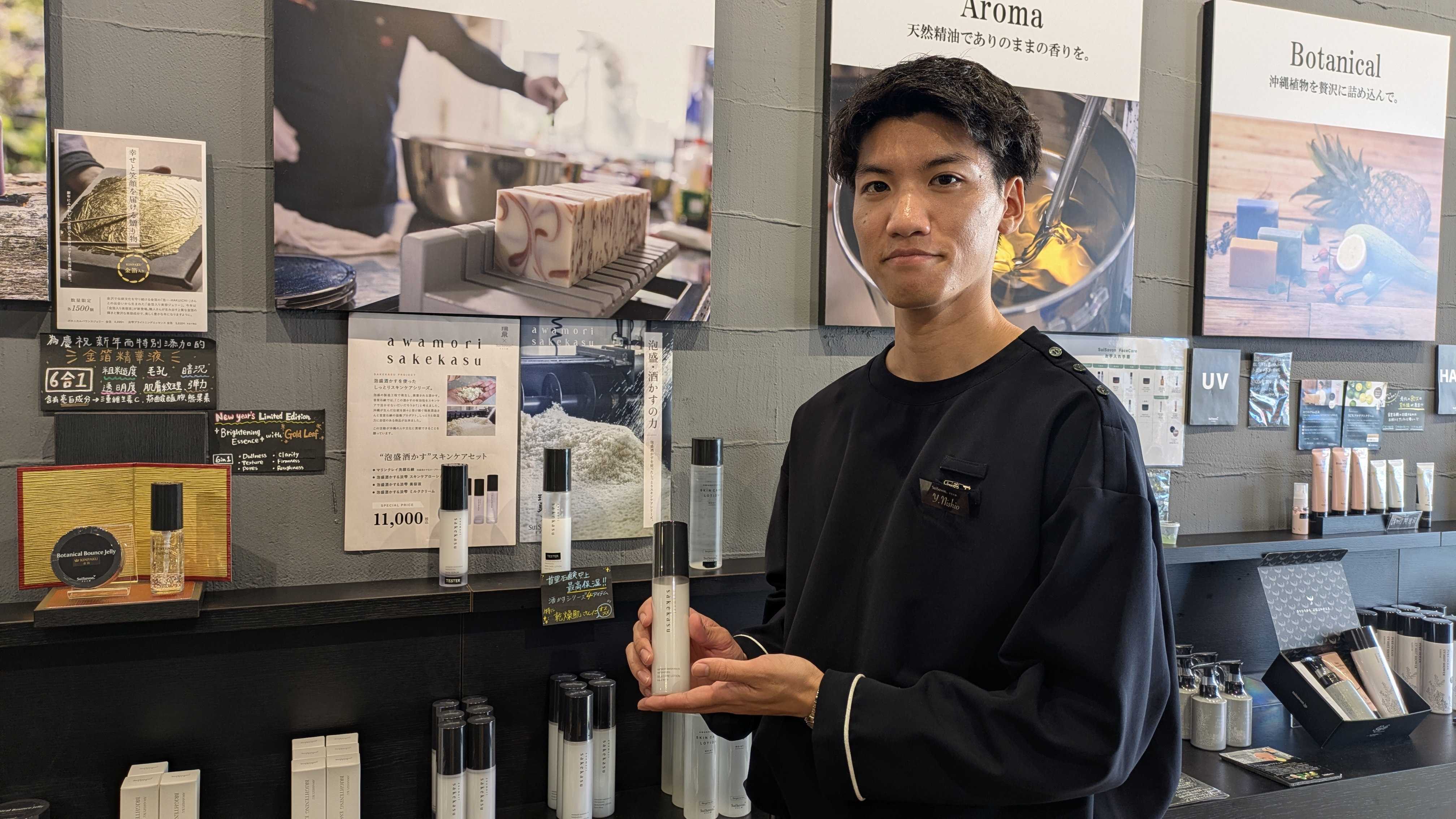 後は、女性社員にメイクや美容のことを教えてもらいながら、女性のお客様にもより寄り添った提案ができるよう、日々知識を積み重ねています。また、実際に自分自身で首里石鹸の商品を使い、使用感を確かめることも大切にしています。「自分が使ってどう感じたか」を言葉にできるようになることで、お客様にもよりリアルで納得感のある提案ができるようになったと感じています。