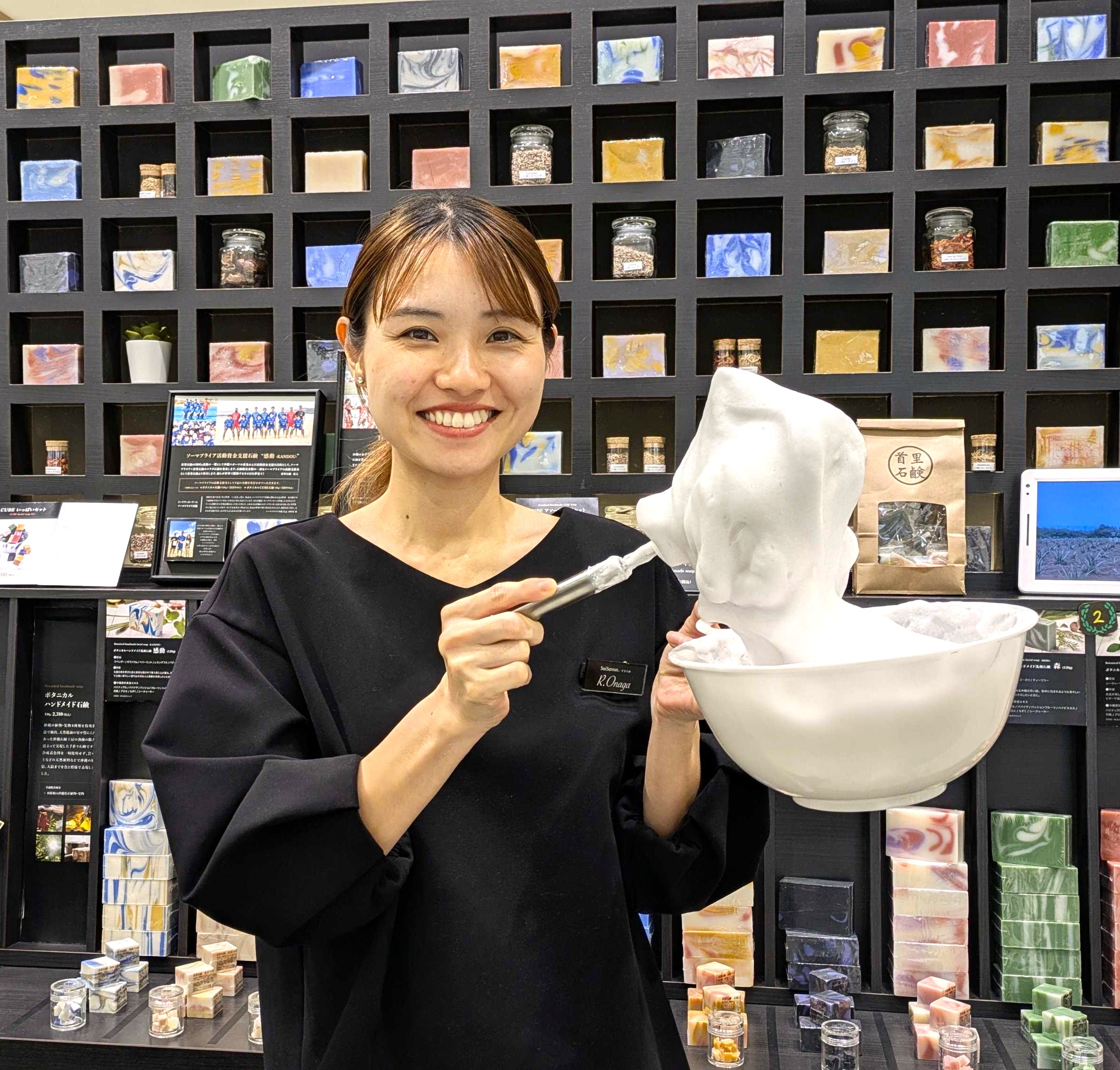首里石鹸初めての方を接客した際に、水場体験や商品紹介を通して首里石鹸の魅力が伝わった瞬間が1番やりがいを感じます。カウンセリングをしてお客様に合う商品をご案内できた時や、何気ない会話からお客様との共通点を発見し、距離感がぐっと縮まりより深くまでお客様を知ることが出来た時、楽しい空間作りができたと感じます。